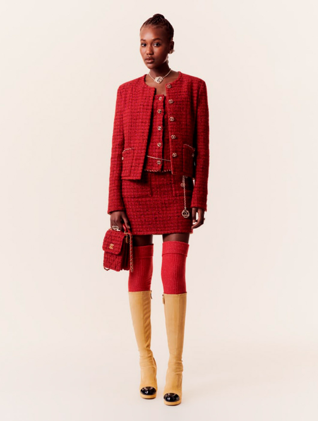 Lady D loves a burgundy moment, which is why this entire look from Chanel’s autumn-winter 2023/24 pre-collection is perfect for any high-powered players looking to follow in her footsteps. The red, purple and black iridescent tweed separates are all classic investment pieces on their own, but for full aristocratic impact, team all of them together and top off with the mini flap bag and the beige-and-black high boots in suede and patent leather. All you need now is the attitude to match the outfit – perhaps a rewatch of seasons one and two are in order?