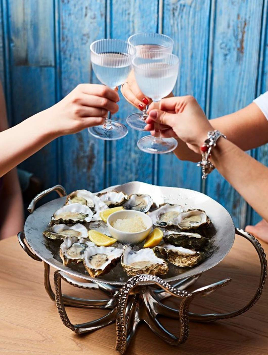 Nestled in ice shavings and elegantly served on a silver octopus stand, with tentacles that curl to support the plate of oysters that surround a little bowl of tart lemon granita, Italy’s answer to sorbet.