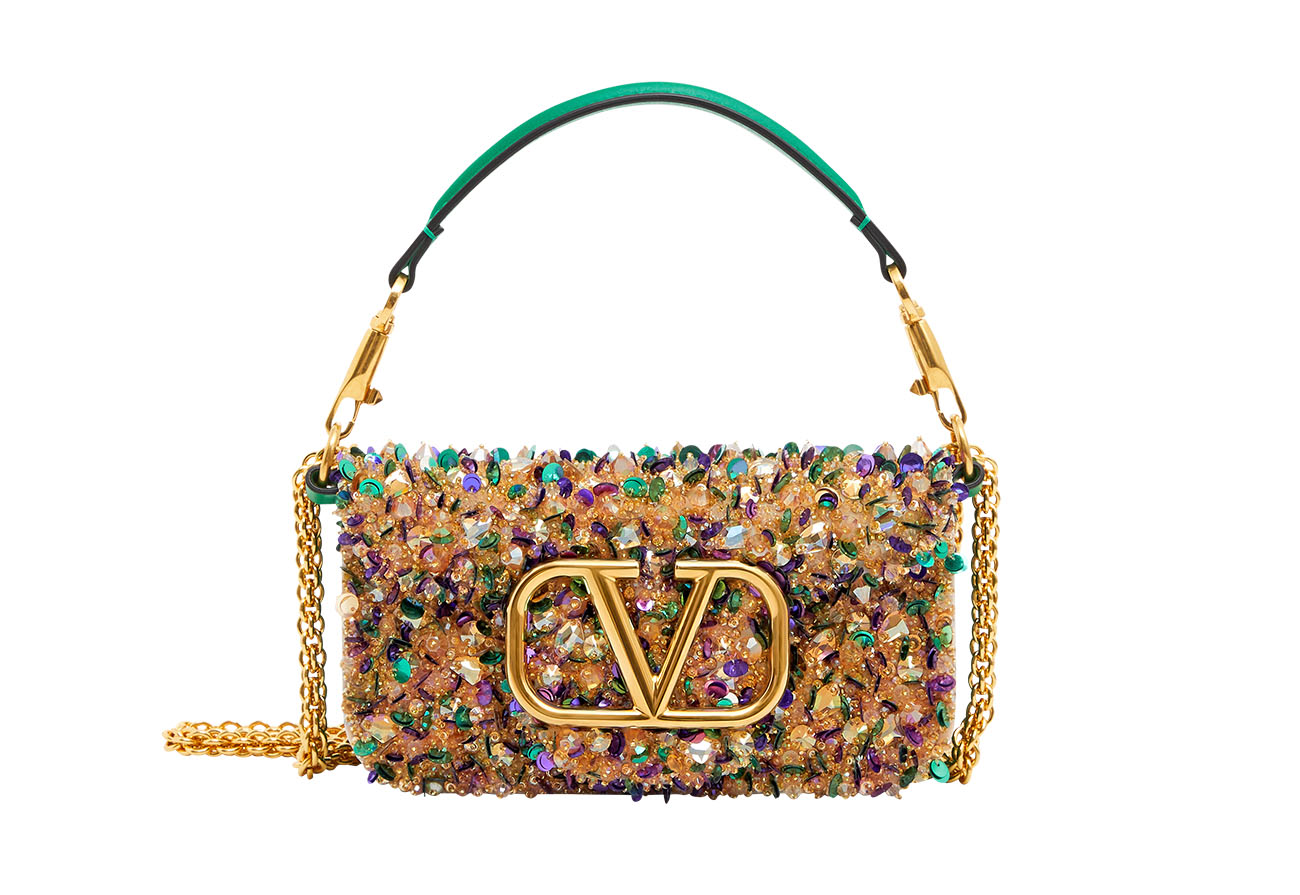 Anya Hindmarch’s gold Crisp Packet clutch bag has eye-catching appeal and is perfect for a party look on New Year’s Eve and beyond. Valentino Garavani’s sparkling sequinned handbag will be, too.