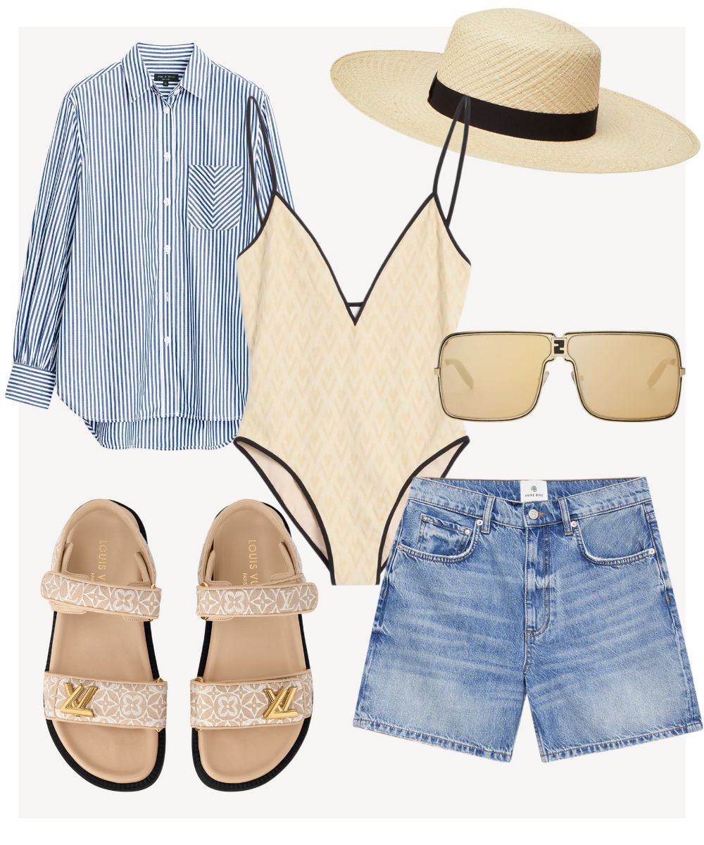 Proof that practical doesn’t mean boring. Throw on a striped men’s shirt, denim shorts and sandals that will go the distance, from beach to bookstore. A wide-brimmed hat and sleek shades = instant chic.