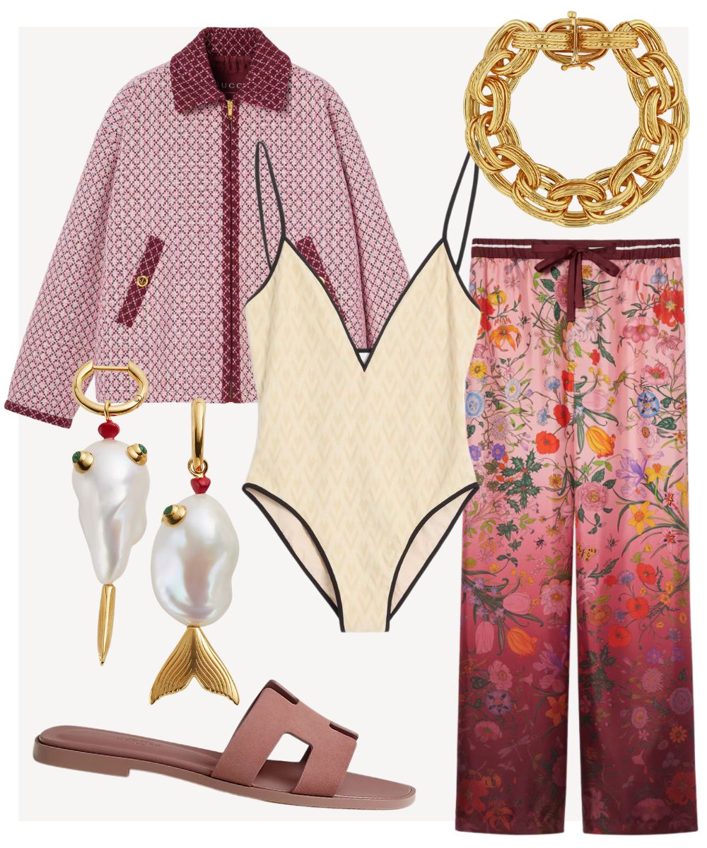 A one-piece—but make it fashion. Style yours with printed silk trousers, gold jewellery and mermaid-worthy earrings. Add a lightweight jacket for cool evenings—and a sense of mystery.